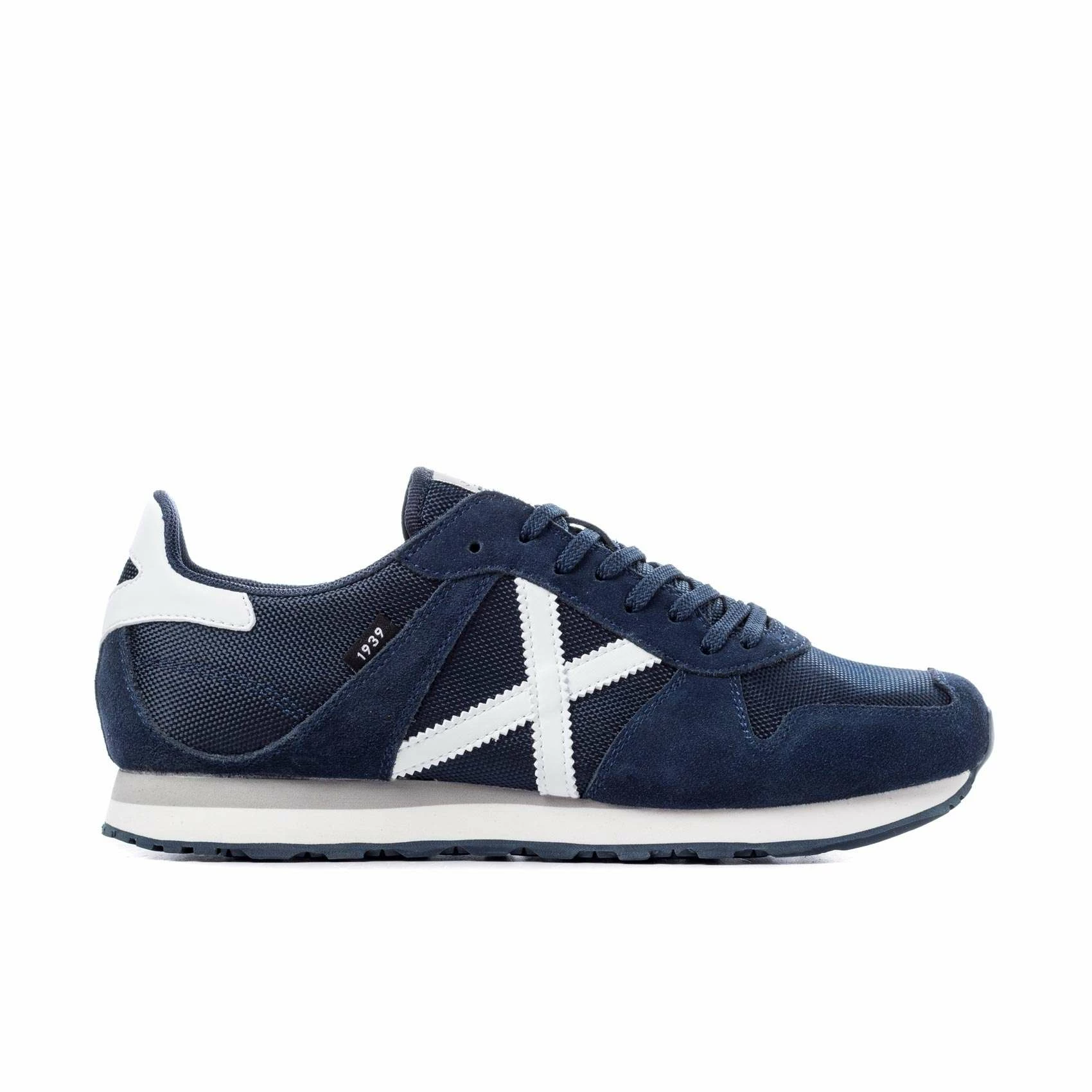 Elaborado con piel serraje azul marino, combinada con tejido nylon del mismo tono con acabados en sintéticos blancos. Incorpora suela color azul marino y entresuela de EVA blanca-gris.