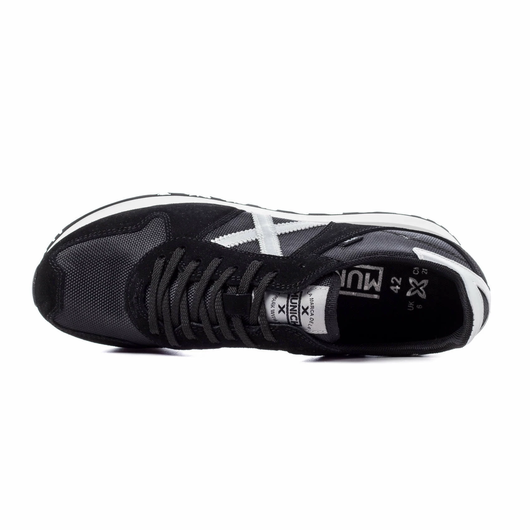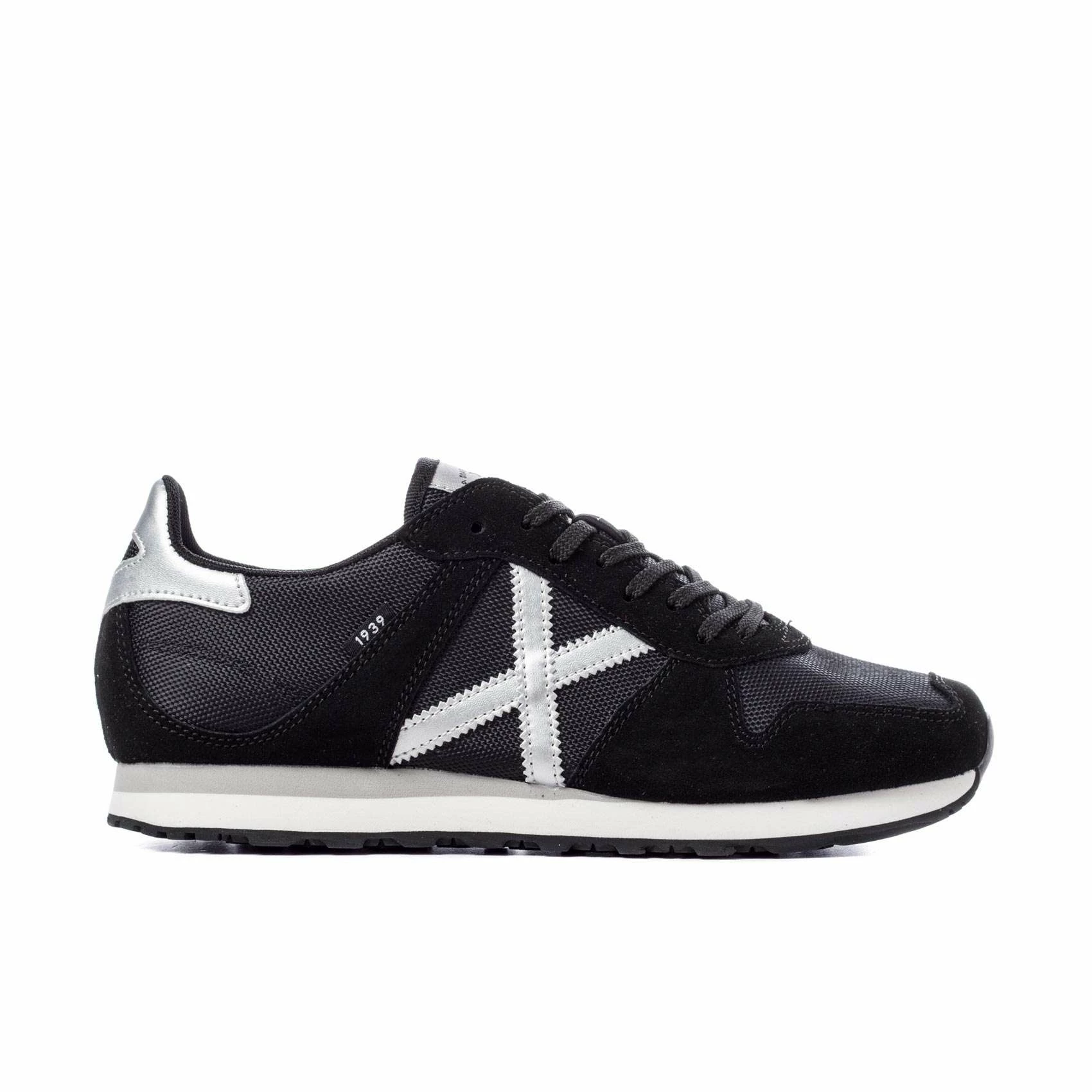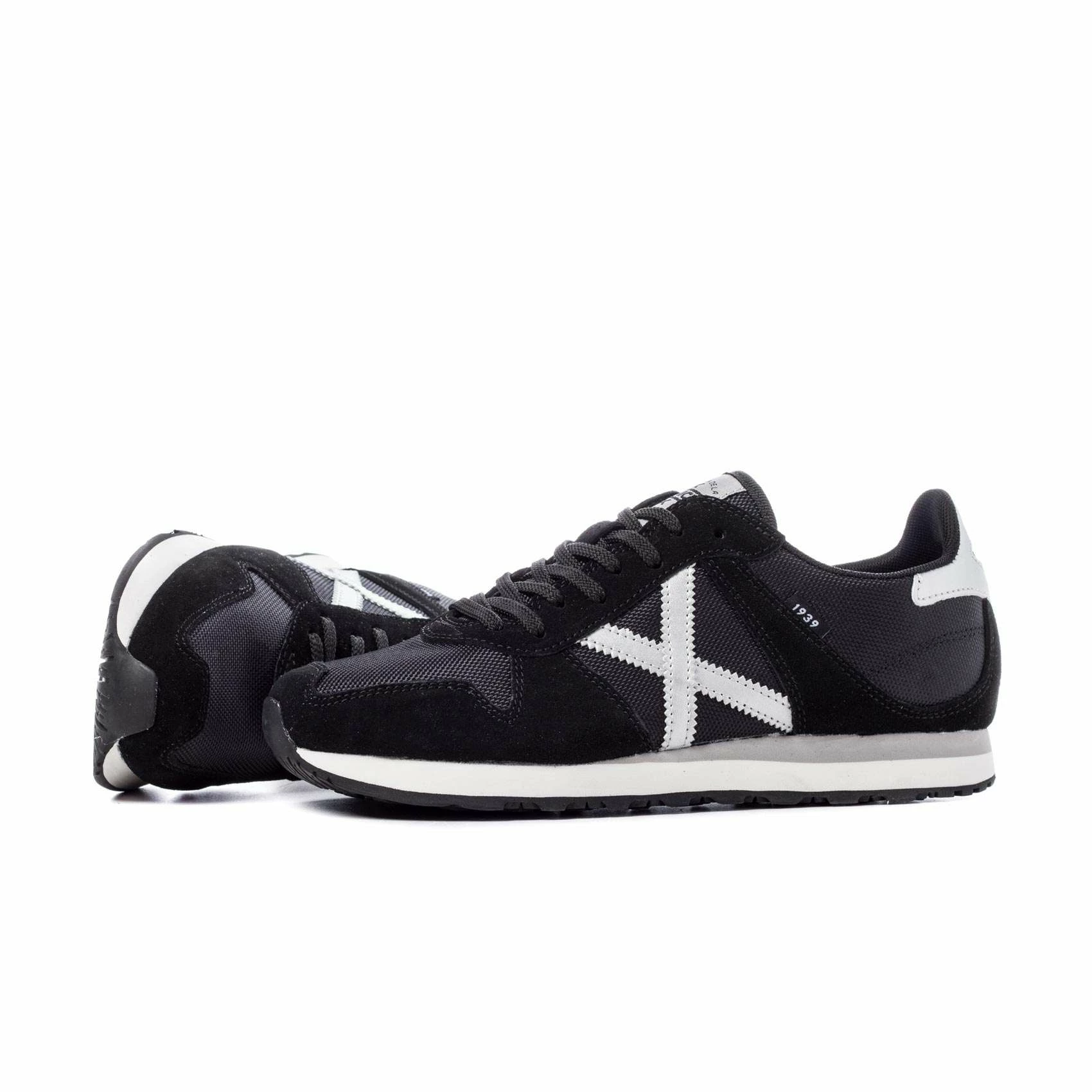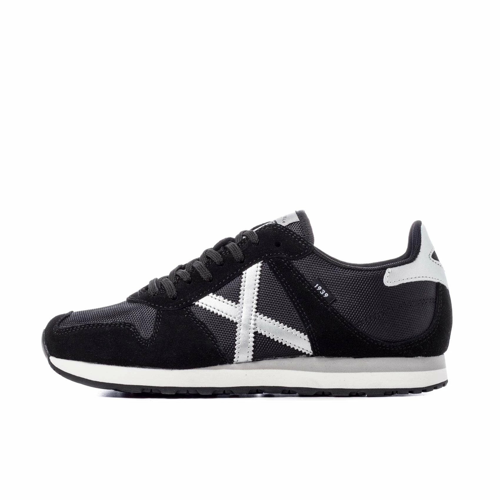 Elaborado con piel serraje negra, combinada con tejido nylon del mismo tono con acabados en sintéticos blancos. Incorpora suela color negro y entresuela de EVA blanca-gris.